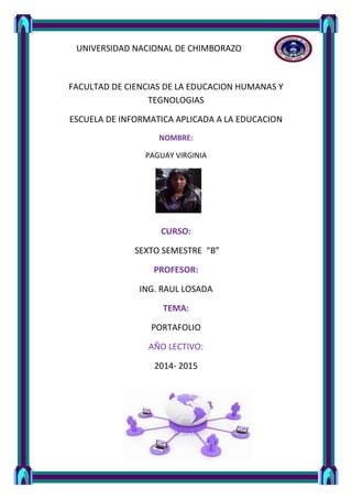 Este documento presenta información sobre un portafolio creado por Virginia Paguay para su sexto semestre en la Escuela de Informática Aplicada a la Educación de la Facultad de Ciencias de la Educación Humanas y Tecnologías de la Universidad Nacional de Chimborazo durante el año lectivo 2014-2015 bajo la supervisión del profesor Ing. Raul Losada.