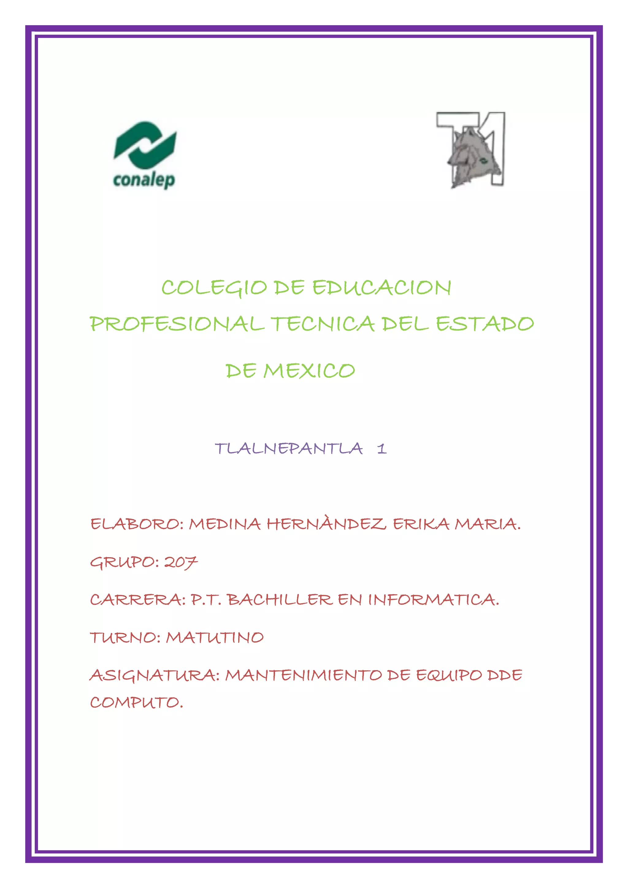 Una estudiante llamada Erika María Medina Hernández del grupo 207 de la carrera de Bachiller en Informática en el turno matutino del Colegio de Educación Profesional Técnica del Estado de México en Tlalneplantla está cursando la asignatura de Mantenimiento de Equipo de Cómputo.