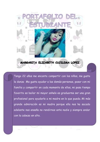 Un estudiante de 22 años de la Facultad de Ciencias de la Educación, Humanas y Tecnológicas de la Universidad Nacional de Chimborazo presenta su portafolio del sexto semestre. Disfruta compartir con niños, bailar, ayudar a otros, y pasar tiempo con su familia. Su mayor aspiración es graduarse para convertirse en un profesional que pueda apoyar a su madre, quien es su mayor inspiración por haber criado a su familia y enseñarles a no rendirse.