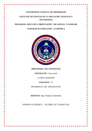 Este documento es el portafolio de una estudiante de psicología educativa de la Universidad Nacional de Chimborazo. Presenta los detalles del curso de Desarrollo del Adolescente que la estudiante Carla Acurio está tomando durante el cuarto semestre del período académico de octubre 2017 a marzo 2018 bajo la docencia de la profesora Marianela Barbatellez.