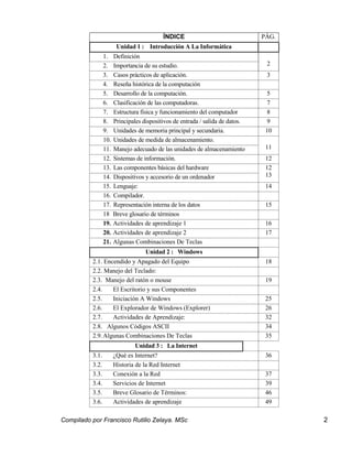 Este documento presenta una introducción a la informática. Explica brevemente la historia de la computación desde los primeros métodos de registro de datos hasta el desarrollo de las primeras computadoras electrónicas en el siglo XX. También define la informática, destaca su importancia y presenta algunos casos prácticos de su aplicación. Finalmente, incluye una bibliografía de recursos adicionales para el estudio de esta unidad.