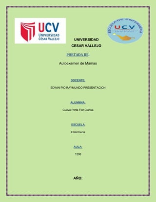 Este documento presenta información sobre el autoexamen de mamas como una herramienta importante para la detección temprana del cáncer de mama. Define el autoexamen de mamas y explica su importancia para reducir la morbilidad y mortalidad por cáncer de mama. Describe los pasos para realizar un autoexamen, incluyendo la inspección visual y la palpación de las mamas y axilas. Concluye resaltando la necesidad de divulgar información sobre los síntomas y estrategias de prevención de cáncer de mama para reducir
