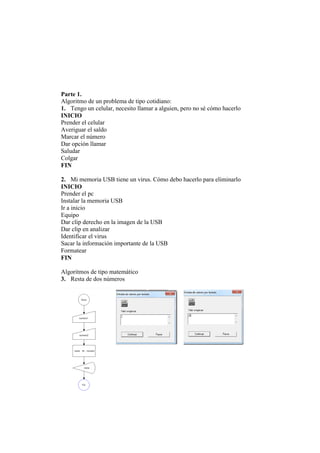 El documento presenta 10 algoritmos para resolver problemas cotidianos y matemáticos. Los algoritmos cotidianos incluyen cómo realizar una llamada telefónica y eliminar un virus de una memoria USB. Los algoritmos matemáticos cubren operaciones básicas como suma, resta, multiplicación y división, así como calcular el área de un cuadrado y convertir unidades de almacenamiento como Gb a Kb o Mb.