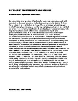 Este documento presenta un proyecto de investigación sobre cómo los niños aprenden los números. Explica que los niños ya tienen algún conocimiento previo de los números antes de entrar a primaria, como contar con los dedos o usar números en juegos. El proyecto analizará los resultados de actividades diseñadas para promover la construcción del concepto de números a partir de experiencias concretas. Concluye que los maestros deben tomar en cuenta los conocimientos previos de los estudiantes para enseñar números de manera significativa.
