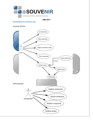 Este documento presenta los diagramas UML y la documentación de un sistema de ventas online llamado Souvenir. Incluye diagramas de casos de uso, actividades, clases, secuencias y la descripción de los productos, servicios y contacto de la tienda Souvenir.