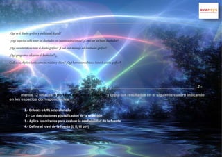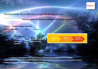 Este documento presenta una ficha de trabajo para Verónica Castro Morales sobre el tema de "¿Qué organismos instituciones necesito conocer en mi campo profesional? ¿En qué empresas me gustaría trabajar?". La ficha incluye instrucciones para buscar información sobre el tema en línea y evaluar 12 enlaces seleccionados según su fiabilidad y nivel. Los enlaces cubren temas como especializaciones de diseño gráfico, características de un buen diseñador, herramientas de diseño, y más.