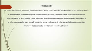 Este documento presenta el plan de estudios de un curso sobre administración de centros de cómputo. El curso consta de cinco módulos que cubren temas como definición y elementos de un centro de cómputo, organización y personal requerido, selección de equipos e infraestructura, guías de operación, y manual del usuario. El objetivo general es describir los diferentes aspectos a considerar en la administración de un centro de cómputo y explicar cómo organizar uno de manera efectiva.