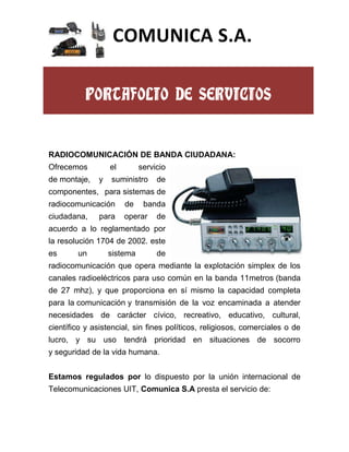 El documento presenta los servicios que ofrece Comunica S.A., incluyendo radiocomunicación de banda ciudadana, radioeléctricos de socorro y seguridad, y servicios especiales. Describe los canales de frecuencia, equipos, y obligaciones legales para operar un sistema de radiocomunicación de banda ciudadana.
