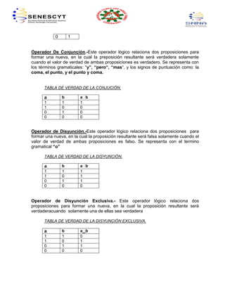 3) Las tablas de verdad muestran los posibles valores de verdad que pueden tomar las proposiciones al realizar operaciones lógicas.