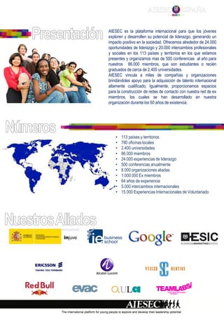 AIESEC es la organización juvenil más grande del mundo, presente en más de 113 países y territorios con 86,000 miembros. Ofrece oportunidades de liderazgo y experiencias internacionales a estudiantes y recién graduados, incluyendo 24,000 experiencias de liderazgo, 500 conferencias anuales, y la capacidad de vincular a miles de compañías con talento internacional altamente calificado. AIESEC se enfoca en proveer una plataforma para el desarrollo del liderazgo de los jóvenes y cambiar el mundo a través
