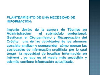 La profesora Angela Fausta Miranda Cruz necesita información sobre sociedades de información crediticia para impartir un curso sobre gestión de crédito. Ella buscará esta información en Internet debido a su accesibilidad y actualización. Si encuentra información útil, proporcionará el enlace a los estudiantes y realizará una sesión de análisis. Utilizó el portal TEMOA donde encontró un Recursos Educativos Abiertos que, después de revisarlo, considera que cumple con los criterios de calidad para que los estudiantes comprendan cómo