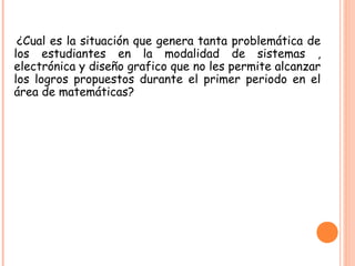 Este documento resume los resultados de un proyecto que sistematizó el rendimiento académico de estudiantes en matemáticas en la modalidad de sistemas, electrónica y diseño gráfico. El proyecto tuvo como objetivos informar los promedios obtenidos en cada grupo, conocer el promedio de estudiantes que perdieron matemáticas, y tabular los promedios de calificaciones entre 5 y 0. El proyecto benefició a la comunidad educativa al informarlos sobre los resultados parciales y razones del bajo rendimiento