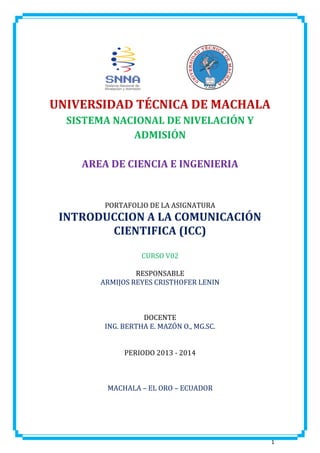 Este documento presenta el portafolio de la asignatura Introducción a la Comunicación Científica (ICC) impartida en la Universidad Técnica de Machala. Incluye la hoja de vida del responsable de la asignatura, el cronograma de clases con los temas a tratar, y apuntes de las primeras cuatro clases sobre bases para la lectura como significado de palabras, antónimos, sinónimos, clasificación y ordenamiento de palabras, y comprensión a partir del contexto.