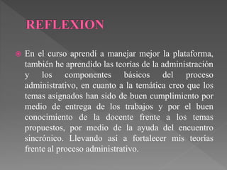 El documento describe las actividades realizadas en un curso de administración. El estudiante aprendió sobre teorías administrativas y el proceso administrativo a través de presentaciones, evaluaciones de términos y resolución de problemas de una empresa. También desarrolló un portafolio que analizó sus aprendizajes y dificultades en cada actividad.