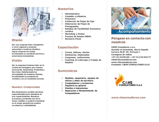 C&HS Consultores s.a.s es una empresa cristiana colombiana que ofrece una variedad de servicios de asesoría, capacitación y suministros de oficina. La empresa fue fundada en 2015 en Cartagena con el objetivo de asesorar a personas y empresas en finanzas, contabilidad, marketing, ventas y otros campos. C&HS Consultores busca ser líder regional y nacional apoyando a sus clientes para alcanzar sus metas a través de soluciones innovadoras y un excelente servicio.