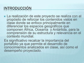 Este documento presenta un resumen de las 13 semanas de un curso de Geografía Mundial III. Cada semana se enfocó en una región geográfica diferente (África, Oceanía o Antártida), cubriendo temas como geografía física, humana y política. Los estudiantes aprendieron a través de presentaciones, videos y proyectos grupales utilizando herramientas tecnológicas. Al final, el documento concluye que el curso permitió reforzar los conocimientos geográficos de manera práct