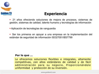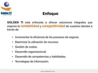 Golden TI ofrece soluciones integrales para mejorar la rentabilidad y competitividad de empresas a través de la optimización de procesos, gestión de costos y desarrollo de talento. Con más de 21 años de experiencia, brinda servicios de consultoría en diversas normativas ISO, mejora continua y tecnologías de la información. Además, proporciona entrenamiento especializado y programas de certificación, apoyando a las PYMES con subsidios gubernamentales.