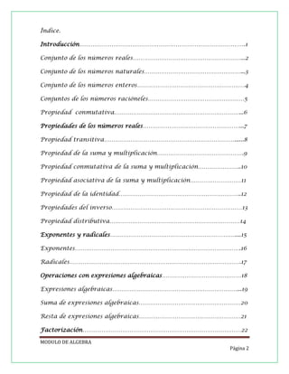 Este documento presenta un módulo sobre álgebra que incluye los siguientes tópicos: conjuntos de números, propiedades de los números reales, exponentes, radicales, expresiones algebraicas, ecuaciones, desigualdades, sistemas de ecuaciones y aplicaciones. El módulo contiene 40 secciones y está dirigido a estudiantes de primer nivel de la carrera de Desarrollo Integral Agropecuario.