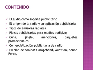 Este documento trata sobre el audio como medio publicitario, incluyendo la historia de la radio y su uso publicitario. Explica los diferentes tipos de emisoras de radio y piezas publicitarias de audio como cuñas publicitarias, jingles y menciones. También cubre temas como la comercialización publicitaria en radio y software de edición de sonido.