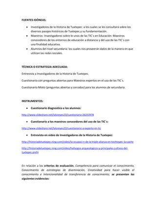 El documento describe un proyecto para dar visibilidad a la historia de Tuxtepec a través de una red social temática y otras redes sociales. Se seleccionará una audiencia de estudiantes de secundaria, maestros y investigadores. Se realizarán entrevistas con investigadores de la historia local y cuestionarios con maestros y estudiantes para recopilar información sobre el tema y el uso de redes sociales con fines educativos. Los hallazgos se utilizarán para crear objetos de aprendizaje sobre la historia de Tuxtepec y difund