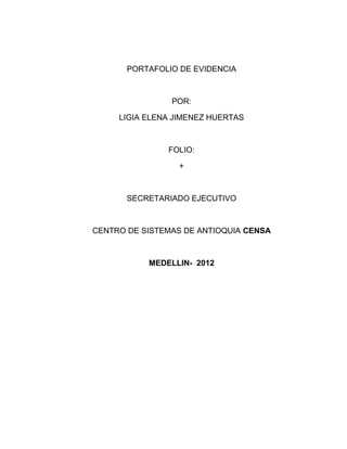 Este documento presenta el portafolio de evidencia de Ligia Elena Jiménez Huertas para el Secretariado Ejecutivo del Centro de Sistemas de Antioquia CENSA en el año 2012.
