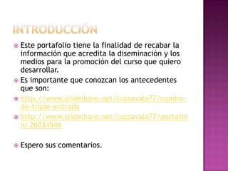 Este documento presenta la información de un portafolio para desarrollar un curso sobre estructuras arquitectónicas. El autor explica que ha elegido participar en conferencias y subir la información a plataformas sociales y repositorios científicos para diseminar su trabajo. Proporciona enlaces a estas plataformas como Facebook, Twitter y SlideShare. El enfoque del curso es pedagógico para estudiantes y profesores de arquitectura, abordando estructuras desde un enfoque de diseño. El autor espera
