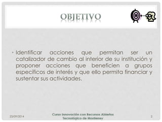 Este documento presenta una hoja de ruta para una práctica educativa que utiliza recursos educativos abiertos (REA) en un curso de química orgánica. La hoja de ruta describe cómo los estudiantes usarán, reutilizarán y remezclarán REA existentes, y también crearán y compartirán sus propios recursos a través de varios canales digitales para generar una comunidad de aprendizaje en torno al uso de REA.