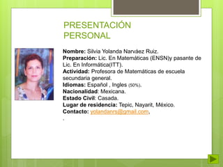 El documento presenta el portafolio de Silvia Yolanda Narváez Ruiz. Incluye información personal, experiencia profesional como profesora de secundaria, conocimientos previos adquiridos a través de cursos y certificaciones, y conocimientos adquiridos en el curso de Maestría en Gestión del Aprendizaje.