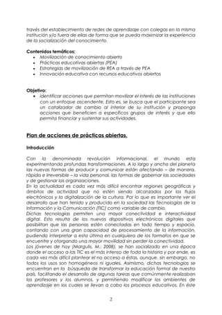 El documento describe un plan de acción para movilizar el conocimiento abierto y las prácticas educativas abiertas a través del uso de recursos educativos abiertos. El plan propone el uso de plataformas como Edmodo y contenidos de educ.ar para cuatro módulos sobre concepciones de comunicación, imagen visual, medios de comunicación y ciudadanía digital para estudiantes de secundaria en Buenos Aires, Argentina.