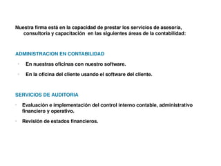La firma ofrece una variedad de servicios de consultoría y capacitación en contabilidad, auditoría, finanzas, impuestos y normalización contable. Los servicios de contabilidad incluyen la administración de contabilidades en las oficinas de la firma o del cliente. La firma también ofrece servicios de auditoría, análisis financiero, planeación tributaria y revisión fiscal.