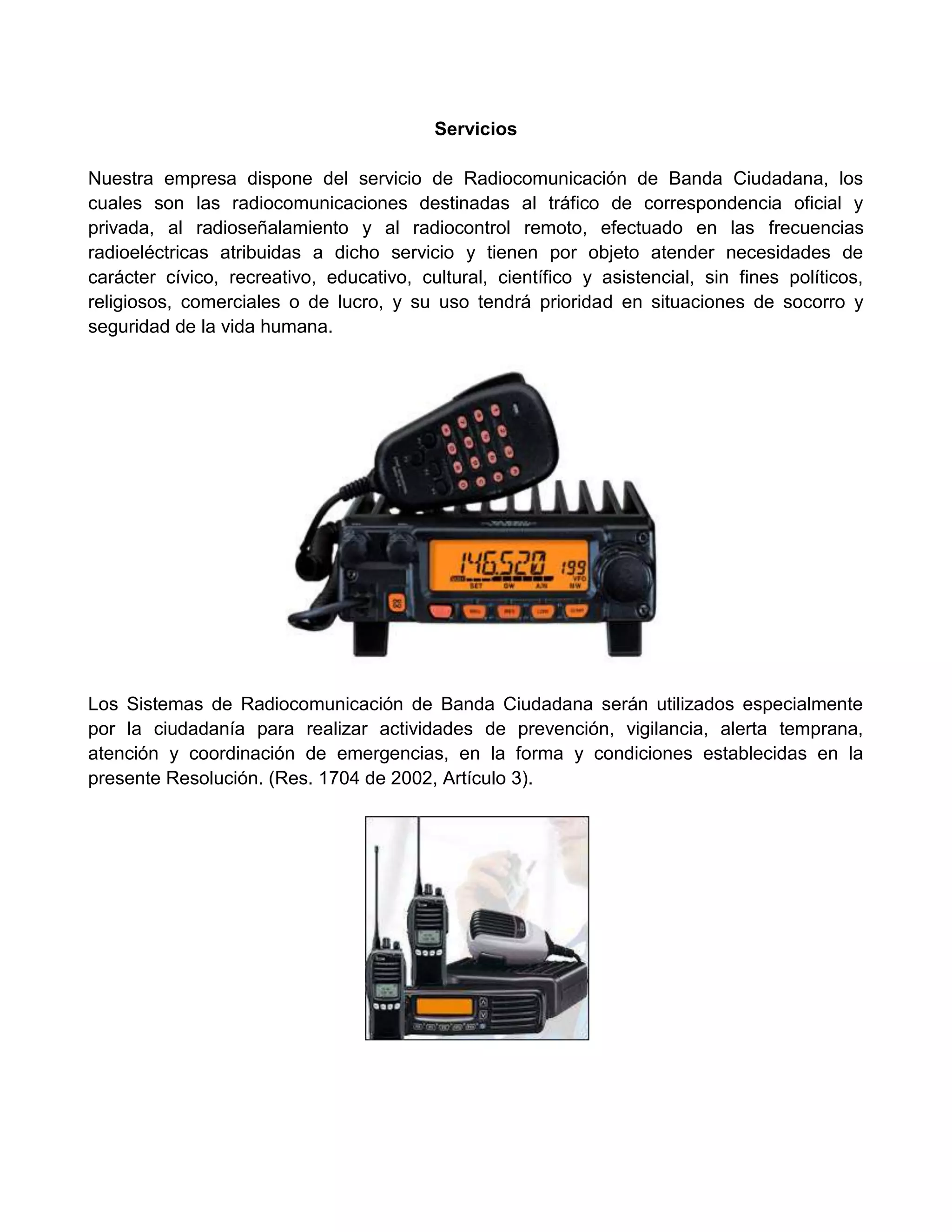Este documento describe los servicios de radiocomunicación de banda ciudadana en Colombia. Estos servicios utilizan frecuencias de radio para comunicaciones cívicas, recreativas, educativas y de emergencia sin fines de lucro. El documento explica la normativa que regula el servicio, las frecuencias asignadas, los requisitos para operadores y equipos, y las obligaciones de los operadores para garantizar el uso apropiado del espectro radioeléctrico.