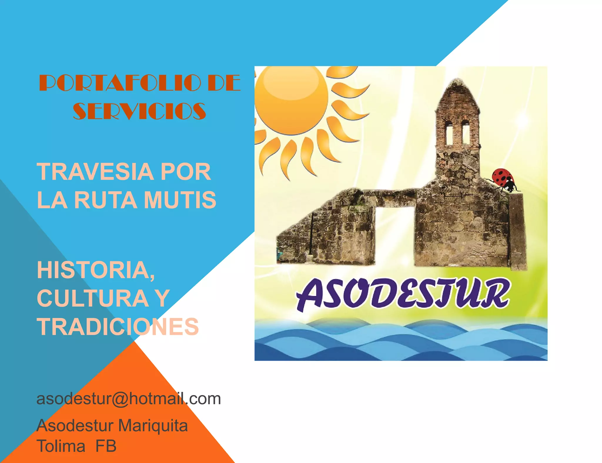 ASODESTUR es una empresa de turismo en Mariquita, Tolima que ofrece una variedad de tours históricos, culturales, ecológicos y de aventura por diferentes lugares del municipio y la región. Su misión es satisfacer las necesidades de los clientes a través de procesos eficientes y de calidad con un equipo humano profesional. Su visión es consolidarse como una de las principales empresas de turismo en la región que ofrece servicios de calidad que incluyen tours convencionales, ecoturismo, turismo histórico y de a