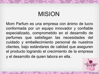 Mom Parfum es una empresa líder en la producción y comercialización de perfumes en Colombia. Su misión es desarrollar perfumes de alta calidad para satisfacer las necesidades de sus clientes bajo estándares de calidad, mientras que su visión es ser una empresa altamente competitiva a nivel local y regional orientada a la satisfacción de los clientes para 2023. La empresa se enorgullece de contar con un personal altamente capacitado y de ofrecer una variedad de fragancias populares como Lune, Estoile Mom y Soleil para deleitar a los client