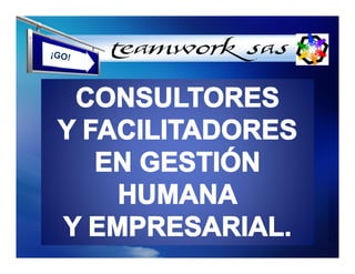 Teamwork S.A.S es una empresa privada que ofrece servicios de formación, capacitación y desarrollo humano a empresas e instituciones en Colombia. Ofrece diversos programas para mejorar la productividad, como seminarios, talleres y asesoría en áreas como trabajo en equipo, motivación, liderazgo y calidad. Su objetivo es ayudar a los clientes a incrementar su productividad de manera sostenible a través del desarrollo de sus empleados.