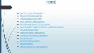 Este documento contiene información sobre el mantenimiento de computadoras. Incluye tablas con registros de computadoras reparadas que detallan sus componentes y posibles soluciones. También describe conceptos como overclocking, partes de una computadora como la motherboard, procesador, memoria RAM y fuente de poder, así como herramientas y técnicas de mantenimiento para optimizar el rendimiento y seguridad de las computadoras.