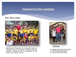 Mediante el uso de las TIC, este documento propone una estrategia lúdica para fortalecer la dimensión cognitiva de los niños del preescolar. Se presentan actividades como el uso de videos educativos, programas como Gcompris y Paint, y el proyecto "Mis Conejos de Colores" para trabajar en equipo y valores. El objetivo es despertar el interés de los niños y mejorar su atención, clasificación de objetos, y respeto por el espacio de los demás a través de actividades dinámicas con tecnolog
