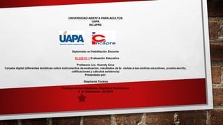 Este documento presenta una carpeta digital con diferentes temáticas sobre evaluación educativa como instrumentos de evaluación, resultados de visitas a centros educativos, una prueba escrita, cálculos de calificaciones y asistencia. Incluye rubricas, listas de cotejo, entrevistas a docentes y un examen de contabilidad. Además, presenta cálculos de rendimiento y asistencia, y una reflexión personal sobre la importancia de la evaluación educativa.