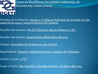 El documento presenta información sobre un portafolio de evidencias para la materia de Instala y Configura Software. El portafolio pertenece a un estudiante de segundo grado de la especialidad de Soporte y Mantenimiento a Equipo de Cómputo en el Centro de Bachillerato Tecnológico Industrial y de Servicios #33 “Leona Vicario”. El documento incluye varios apuntes sobre temas relacionados con procesos, sistemas operativos, planificación de procesos y comunicación entre procesos.