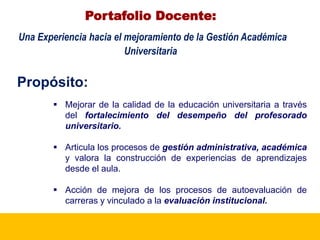 Este documento describe el portafolio docente de la Universidad Especializada de las Américas, el cual tiene como objetivos mejorar la calidad de la educación universitaria y fortalecer el desempeño de los profesores. El portafolio incluye información sobre la docencia, investigación, extensión y gestión de cada profesor, y ayuda a evaluar y mejorar continuamente su práctica docente. La implementación del portafolio se realizará en cuatro fases: planificación, capacitación, diseño y resultados con seguimiento.