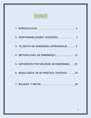 Este documento presenta el portafolio docente de Samuel Emilio Córdova López, maestro de sexto grado. Incluye una introducción, las responsabilidades docentes, la filosofía de enseñanza-aprendizaje, la metodología de enseñanza utilizada, los esfuerzos por mejorar la enseñanza, los resultados obtenidos y metas futuras. El documento describe las asignaturas impartidas, estrategias didácticas implementadas y una reflexión sobre las fortalezas y áreas de oportunidad como docente.