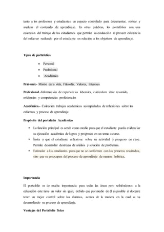 El documento describe el portafolio como un método de enseñanza, aprendizaje y evaluación que consiste en la recopilación de trabajos del estudiante para mostrar su progreso. Explica que existen diferentes tipos de portafolios como el personal, profesional y académico. Además, señala las ventajas e inconvenientes de los portafolios físicos y digitales.