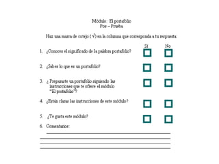 Este documento explica qué es un portafolio y cómo prepararlo. Un portafolio es una carpeta o CD que contiene evidencia del trabajo realizado en un curso, como ensayos, informes, proyectos y reflexiones. Sirve para autoevaluarse y demostrar lo aprendido. Debe contener una portada, autopresentación, prontuario del curso y muestras del trabajo realizado, lecturas, investigaciones y actividades, además de reflexiones semanales. Puede ser manual o electrónico.