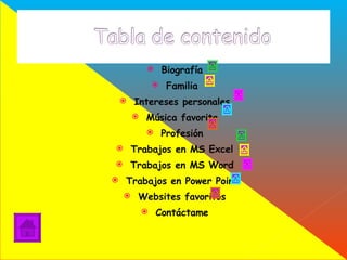 Este documento presenta información biográfica sobre Carolina Brau, una estudiante de 17 años que estudia en el Colegio Marista. Detalla su familia, incluyendo sus padres y hermano, sus intereses como bailar, y su aspiración de estudiar para ser quiropráctica. También enumera algunos de sus trabajos realizados en Microsoft Excel, Word y PowerPoint.