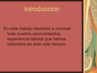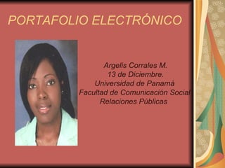 Este documento presenta el portafolio de Argelis Corrales. Incluye sus datos personales, formación académica, conocimientos, experiencia laboral y referencias. Actualmente trabaja como asistente de compras y ventas en Constructora Bello Hogar luego de haber trabajado como asesora de servicio y cajera en Doit Center y como impulsadora en Industrias Panamá Boston. Estudió relaciones públicas en la Universidad de Panamá y cuenta con capacitación en nuevas tecnologías.