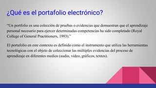 Este documento describe el portafolio electrónico, sus objetivos, beneficios y ventajas. Explica que un portafolio es una colección de evidencias que demuestran el aprendizaje de un estudiante. Un portafolio electrónico utiliza herramientas tecnológicas para recopilar evidencias en diferentes formatos. Sus objetivos son guiar el aprendizaje estudiantil y mostrar su progreso. Ofrece ventajas como información amplia sobre el aprendizaje y la capacidad de compartir resultados. Finalmente, describe herramientas como