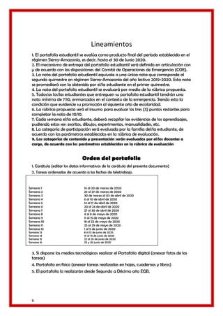 Este documento presenta las instrucciones para el portafolio estudiantil de Erick Santiago Osorio Canchig para el segundo quimestre del año escolar 2019-2020. El portafolio debe incluir las tareas semanales desde marzo hasta junio, organizadas por semana. Será evaluado según una rúbrica que considera el contenido, presentación y participación. El portafolio demostrará los aprendizajes del estudiante durante el periodo de teletrabajo.