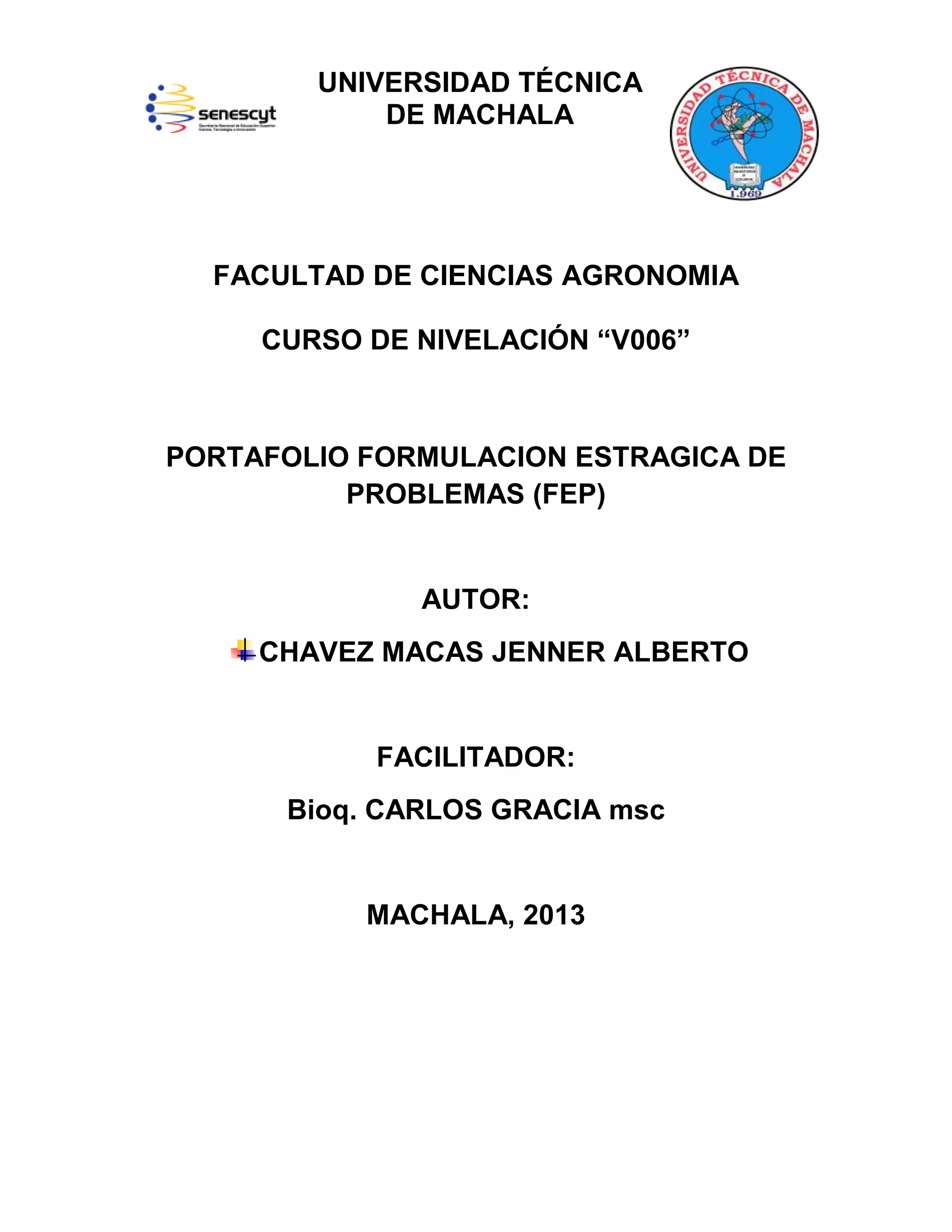 Este documento presenta un portafolio de formulación estratégica de problemas desarrollado por Jenner Alberto Chávez Macas para el curso de nivelación "V006" en la Facultad de Ciencias Agronómicas de la Universidad Técnica de Machala en 2013. El portafolio contiene 10 lecciones organizadas en 4 unidades que abordan temas como las características de los problemas, procedimientos para su solución, problemas de relaciones con una variable y problemas relativos a eventos dinámicos. El objetivo es desarrollar habilidades para