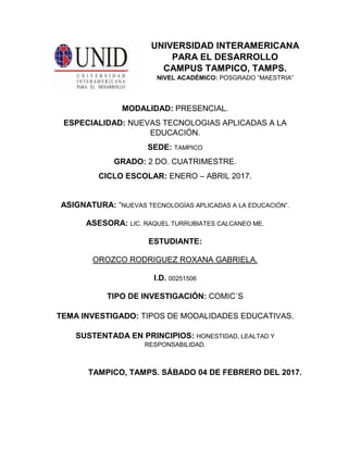 Este documento resume una investigación sobre diversas modalidades educativas realizada por Roxana Gabriela Orozco Rodríguez como parte de sus estudios de maestría. El documento describe las modalidades educativas presencial, a distancia, virtual, en línea y móvil. También analiza el tema de la brecha digital y cómo afecta el acceso y uso de la tecnología en la educación. El objetivo es dar a conocer estas modalidades y reflexionar sobre los desafíos de cerrar la brecha digital para mejorar la educación.