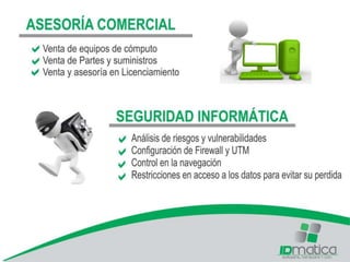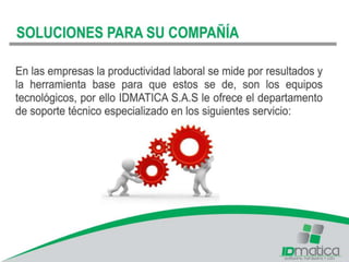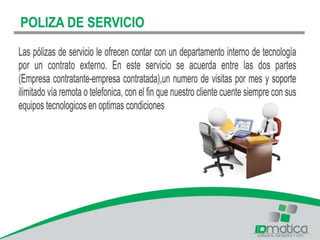 Este documento presenta tres planes de soporte técnico para pequeñas y medianas empresas, incluyendo los equipos cubiertos, cantidades, valores unitarios y visitas mensuales incluidas por parte de un técnico. El plan básico cuesta $260,000 por mes y cubre 6 computadoras, 1 circuito cerrado de TV e impresoras con 2 visitas. El plan avanzado cuesta $435,000 por mes con más equipos y 4 visitas. El plan premium cuesta $450,000 por mes y es el más completo con 13 computadoras, 2 servidores,