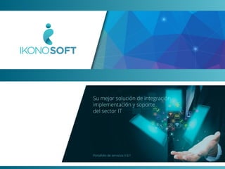 El documento presenta los servicios de integración, implementación y soporte de tecnología de información que ofrece Ikonosoft. Describe una variedad de servicios como reducción de costos, gestión de proyectos, soporte de hardware y software, servicios en la nube, respaldo de datos, comercio electrónico y más, con el objetivo de ayudar a las empresas a sacar el máximo provecho de su infraestructura tecnológica de manera segura y rentable.